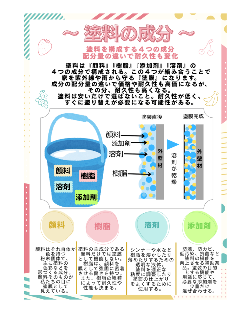 塗料は、『顔料』『樹脂』『添加剤』『溶剤』の4つの成分で構成されています!